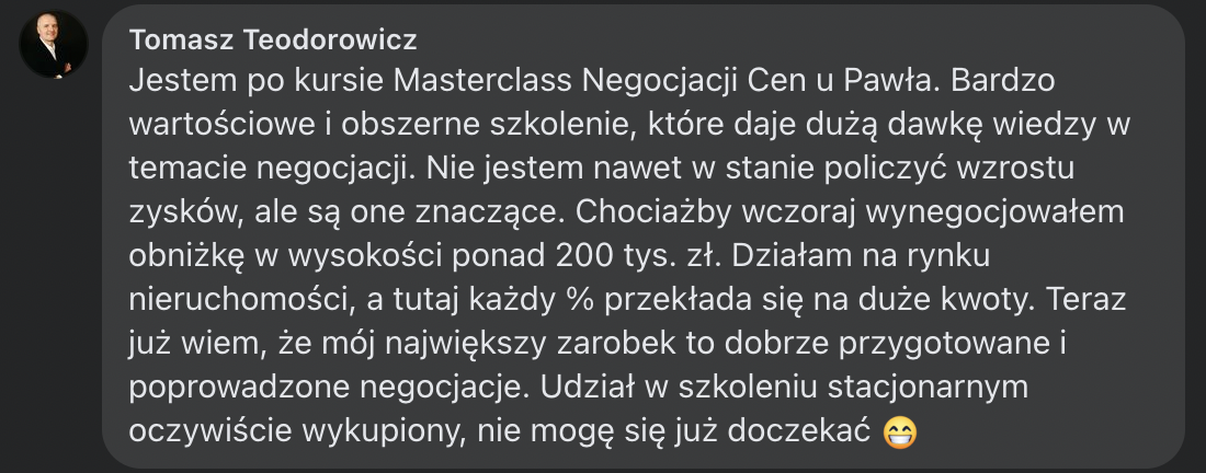 Tak! Moi kursanci osiągali konkretne rezultaty jako początkujący - nauczyli się negocjować właściwie od samego początku, zamiast wyrabiać złe nawyki.